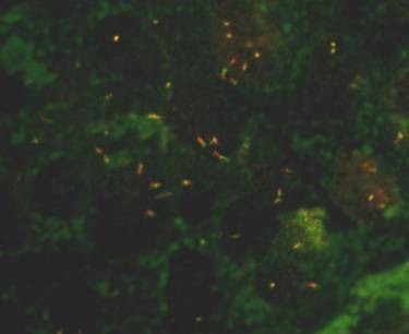 可能的原因 推薦的解決方案 未添加探針(別笑,特別是探針和雜交緩沖液分開的非預(yù)混情況) 探針充分解凍,確保移液器吸取到探針試劑。 探針、雜交緩沖液使用前沒有充分混勻(非預(yù)混探針) 吹打探針混合液,使探針充分混勻,短暫離心。 探針添加數(shù)量不足 確保移液器吸取準確,探針加入量足量,請不要稀釋探針(包括預(yù)混和非預(yù)混)。 使用前確保探針解凍充分并達到室溫。 變性前標本未制備好 請參照說明書中標本制備相關(guān)說明。 標本及探針變性不充分 確保玻片進行變性時溫度在推薦的溫度。 將玻片變性時間延長2~4分鐘。 變性前標本未制備好 請參照說明書中標本制備相關(guān)說明。 標本及探針變性不充分 確保玻片進行變性時溫度在推薦的溫度。 將玻片變性時間延長2~4分鐘。 雜交條件不合適 確保遵守雜交所規(guī)定的時間和溫度。 橡皮膠封片時勿留縫隙。 根據(jù)情況,調(diào)整雜交時間(跨度一般較大)和濕度。 雜交時蓋玻片下有氣泡形成 放蓋玻片時要覆蓋探針表面,輕輕擠壓以便擠出氣泡。 玻片干燥不充分 探針滴加至玻片前,確保玻片上的乙醇溶液已經(jīng)完全揮發(fā)。 探針干燥太快 探針滴加后應(yīng)立即將蓋玻片覆蓋目標區(qū)域。 進行洗脫時,一次只能移除一張玻片上的蓋玻片,并且在移除下一張之前立即將玻片浸入洗脫液中。 洗脫液或洗脫條件不正確 確保按照產(chǎn)品說明書要求配制洗脫液(生產(chǎn)商提供洗脫液的除外)。 確保洗脫液的溫度達到洗脫步驟所規(guī)定溫度。 玻片浸入洗脫液前移去蓋玻片。 探針或標本玻片儲存不正確 確保探針-20℃避光保存。 將未雜交玻片干燥后置于-20℃長期保存或者室溫短期保存(一般不超過兩星期)。 將雜交后玻片置于-20℃避光保存。 觀察時所選用的濾光片不合適 使用正確濾光片觀察探針熒光情況。詳情咨詢探針供應(yīng)商。 顯微鏡構(gòu)造及物鏡不適宜觀察FISH標本,或者濾片組損傷 請聯(lián)系顯微鏡制造商。 汞燈使用時間超過設(shè)計時間 請更換汞燈。