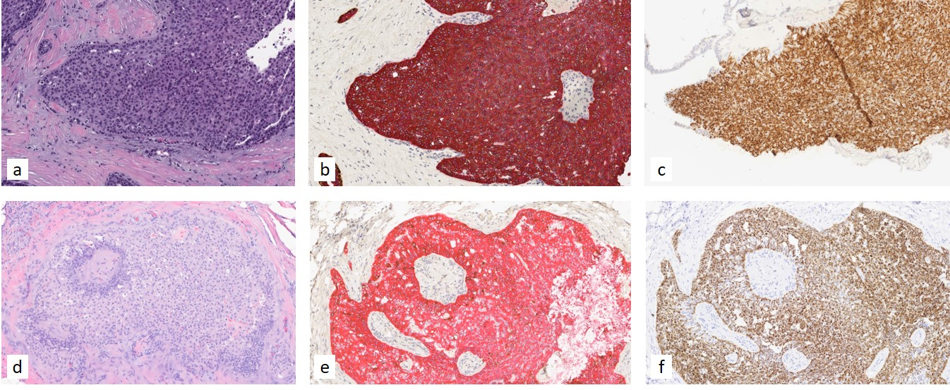 文獻示圖3:患者2。顯微鏡下類似卵黃囊的組織學結構由微囊性結構與篩狀和網(wǎng)狀特征混合而成(A、B);類似Schiller-Duval體的結構(C);局灶性乳頭狀區(qū)域(D);實性區(qū)域中包含形態(tài)多樣的上皮樣/橫紋肌樣細胞,毗鄰未成熟的小細胞(E);局灶性的細胞外基底膜樣物質(F)。