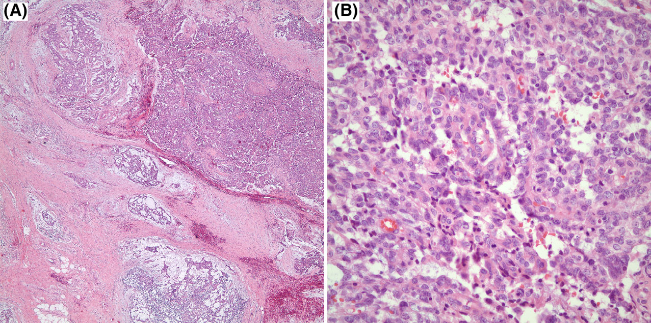 文獻示圖1:患者1。A.一個界限不清的多結節(jié)性上皮樣腫瘤在軟骨粘液樣背景下形成了篩狀結構、條索和小梁。B.腫瘤細胞局灶性核多型性,核仁明顯,有絲分裂活動增加。注意中心的類似Schiller-Duval體的形態(tài)。