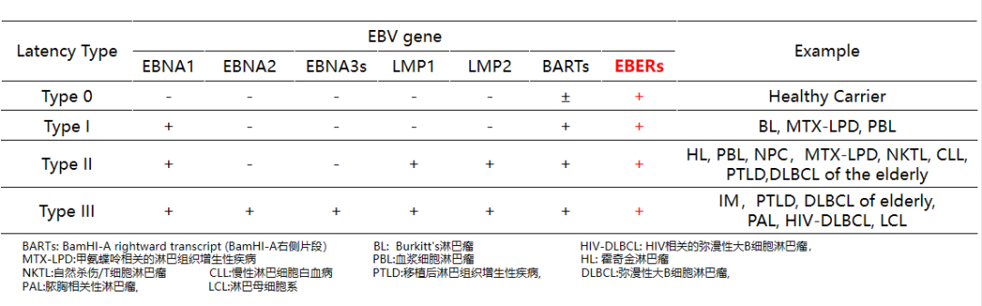 EBERs:指的是2種EBV非編碼RNA(EBER-1、EBER-2)。EBERs在每個細(xì)胞的細(xì)胞核中約100萬個拷貝,并在病毒潛伏期和增殖期均高水平表達(dá),是檢測EB病毒感染的有用標(biāo)志物。