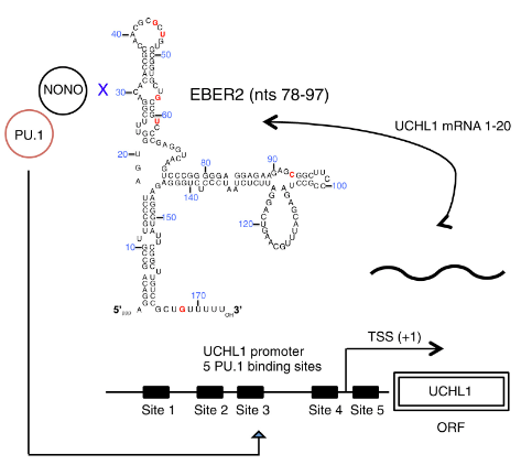 眾多研究表明:EBERs可以通過結(jié)合或調(diào)控LA蛋白、PAX5、AUF-1、IL-10、PKR等細(xì)胞產(chǎn)物分別促進(jìn)感染細(xì)胞的增值及誘導(dǎo)對細(xì)胞凋亡的抗性。其中EBER2在病毒致癌過程中表現(xiàn)出更強(qiáng)的潛力,同時在宿主病毒感染中調(diào)節(jié)更多的致癌相關(guān)因子。根據(jù)最新的一篇文獻(xiàn)報道:EBER2可調(diào)控UCHL1蛋白10倍于正常表達(dá)水平,從而誘導(dǎo)賦予EBV感染的B細(xì)胞在免疫反應(yīng)開始之前快速分裂,進(jìn)而增強(qiáng)了病毒的致癌潛力。