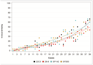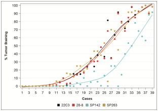 從階段Ⅰ的數(shù)據(jù)來看,四種檢測(cè)方法中,28-8、22C3和SP263在腫瘤染色方面一致性較好,唯有SP142是個(gè)例外;在四種方法中,免疫細(xì)胞上PD-L1的表達(dá)較之腫瘤細(xì)胞上的表達(dá)差異性更大(參見圖1和2);依然有36.9%的病例表現(xiàn)出不一致的結(jié)果。免疫組化依然作為檢測(cè)PD-L1蛋白表達(dá)的金標(biāo)準(zhǔn),鼓勵(lì)使用陽性/陰性來定義PD-L1的表達(dá),但可能會(huì)朝向定義更加多元化的判定來替代單一的Cutoff值。