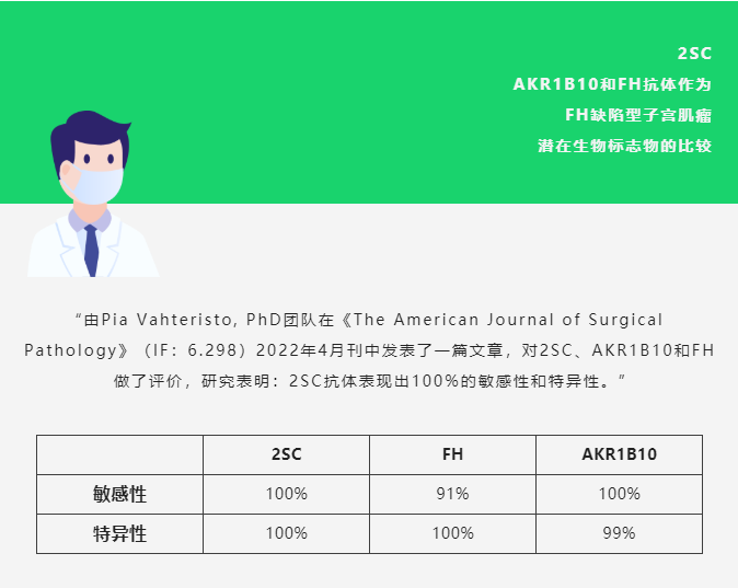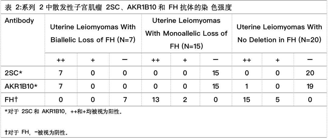 因此,F(xiàn)H的雙等位基因失活導致蛋白質(zhì)的異常琥珀化。經(jīng)證明,檢測琥珀酸化蛋白的2SC抗體可以高靈敏度和高特異性地識別HLRCC 相關的子宮平滑肌瘤。