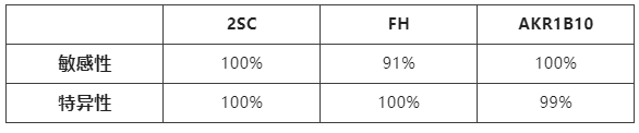 2SC抗體在兩個樣本系列中均表現(xiàn)出100%的敏感性和特異性優(yōu)于AKR1B10和FH。